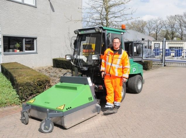 Jeroen Thomassen poseert voor zijn nieuwe Hoaf Weedair op een Nimos werktuigdrager voor de werf van de gemeente Vught.