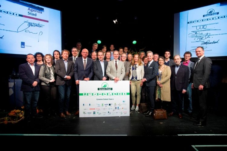 Begroeide (gebruiks)daken bieden kansen om ecosystemen te versterken in de gebouwde omgeving. Ze zijn een belangrijke ingrediënt van het zogenaamde natuurinclusief bouwen. Ze kunnen ecosysteemdiensten leveren zoals het afvangen van fijn stof, het verlagen van de koellast in gebouwen, het verminderen van hittestress in steden, het bufferen van water tijdens hevige regenval en het vergroten van biodiversiteit. Bovendien biedt een begroeid dak verruiming van de gebruiksruimte en zorgt het voor een verlenging van de levensduur van de beschermde dakbedekking. Bewezen is dat vergroening in de stedelijke omgeving ook goed is voor het welzijn en (geestelijke) gezondheid van de mens. Daken kunnen als geen ander ingezet worden voor die vergroening waardoor ook bij zichtdaken het concentratievermogen van de stadsmens verbeterd wordt. Wanneer bij begroeide daken inmiddels ook het waterbufferend vermogen en biodiversiteit meegenomen wordt kan de stedelijke omgeving in het kader van Climate Proof bouwen worden ingericht. Subsidies Verschillende gemeenten geven subsidies voor de aanleg van groene daken. De hoogte en voorwaarden per gemeentelijke regeling verschillen sterk. Veel potentiële eigenaren zien nog te veel bezwaren om de investering in een groen dak te laten renderen. De voordelen zijn onvoldoende bekend bij hen, en de baten van bijvoorbeeld de waterbuffering betalen zich niet terug bij de investeerder. Om die reden is ook het beleid om groene daken mee te laten rekenen in de wateropgave bij elk waterschap weer anders. In het huidige tijdsbeeld past de ontwikkeling van nieuwe maatschappelijke verdienmodellen waarin via een open gezamenlijk ontwikkelproces in een multi-stakeholder overleg met alle betrokkenen wordt gezocht naar een werkwijze waarin kosten en baten via een win-win-model opnieuw worden geordend en afgesproken. In de voorloper van deze Green Deal (fase 1) is een aantal sporen uitgewerkt om toepassing groene daken te stimuleren, belonen en in kaart te brengen. Dat zijn de vijf sporen die hierboven werden genoemd. Nieuwe sporen Nieuw uit te werken sporen zijn onder andere landelijke stimulansen, gemeentelijke regelgeving en specifieke labels. Sinds de ontwikkeling van een nieuwe stimulering voor groene daken in de Green Deal Groene Daken (fase 1), is er meer zicht op concreet te behalen resultaten, en zijn er significant meer partners bij de Green Deal aangehaakt. Daarom wordt in deze Green Deal, de Green Deal Groene Daken fase 2, gekozen voor een nieuwe ondertekening om het proces binnen en tussen de deelnemende organisaties steviger te verankeren en daarmee het proces van samen leren, ontwikkelen, experimenteren en toepassen te versnellen. De Green Deal werd ondertekend door: 1. Staatssecretaris Martijn van Dam (Economische Zaken) 2. Staatssecretaris Sharon Dijksma (Infrastructuur en Milieu) 3. Leven op Daken B. V. , vertegenwoordigd door Erik Steegman, directeur. 4. ZinCo Benelux B.V., vertegenwoordigd door Harmen Riemens, Account Manager. 5. Mastum Daksystemen B.V., Marc Evers, algemeen directeur. 6. BTL Nederland B.V. vertegenwoordigd door directeur Olaf Janssen. 7. Van der Tol groep B.V., vertegenwoordigd door commercieel directeur Aart Veerman.. 8. Sempergreen, vertegenwoordigd door Urban Green Consultant Arnoud de Romph. 9. Optigroen Dak- en gevelbegroeiing, vertegenwoordigd door directeur Benelux Henk Vlijm. 10. Nelen & Schuurmans, vertegenwoordigd door Fons Nelen, Directeur. 11. Het college van Gedeputeerde Staten van de provincie Noord-Brabant, handelend als bestuursorgaan en daartoe gemachtigd door de Commissaris van de Koning, namens deze, de heer drs. J.J.C. (Johan) van den Hout. 12. Het college van B&W van gemeente Amsterdam, handelend als bestuurorgaan, namens deze, de heer A. Choho. 13. Het college van B&W van gemeente Enschede, handelend als bestuurorgaan, namens deze, de heer J. van Agteren. 14. Het college van B&W van gemeente Almere, handelend als bestuurorgaan, namens deze, de heer F. Huis. 15. Het college van B&W van gemeente Tilburg, handelend als bestuurorgaan, namens deze, de heer M. Jacobs,. 16. Waterschap Vechtstromen, vertegenwoordigd door de heer dr. S.M.M. Kuks, Watergraaf. 17. Waterschap Amstel, Gooi en Vecht, vertegenwoordigd door mevrouw P.A.M. Hoog, Lid Dagelijks Bestuur. 18. VHG, vertegenwoordigd door directeur Egbert Roozen. 19. Vebidak, Vereniging Dakbedekkingsbranche Nederland, vertegenwoordigd André van den Engel, adjunct-directeur. 20. VBB, Vereniging Bouwwerk Begroeners, vertegenwoordigd door voorzitter Dirk Roosendaal. 21. De Vlinderstichting, vertegenwoordigd door Albert Vliegenthart, ecoloog projectleider. 22. Amsterdam Rainproof, vertegenwoordigd door Daniel Goedbloed, Programma Manager. 23. Stichting VIBA-Expo, vertegenwoordigd door Adriaan van Mierlo, directeur. 24. Nationaal Groenfonds, vertegenwoordigd door Brigitte Bultinck, adviseur. 25. Stichting Roof Update, vertegenwoordigd door Ronald van Bochove, directeur. 26. Hogeschool Inholland, vertegenwoordigd door dr. drs. ir. C.M. Ravesloot, Lector. 27. Nederlands Instituut voor Ecologie (NIOO), vertegenwoordigd door mevrouw Petra van den Berg, directeur bedrijfsvoering.