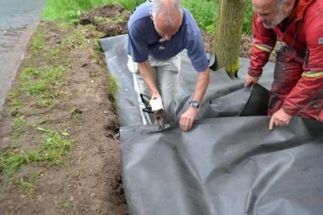 Uitdaging in het aanbrengen van het doek zijn plekken rondom bomen, waar het lastig is het doek mooi “duizendknoopdicht” te maken. Om het doek zo goed mogelijk om de boom te leggen, krijgt deze een soort rubberen kraag (nog niet te zien op de foto). Als de plant nog ergens opduikt, dan zal het op deze plekken zijn vertelt Zweers. Maar als er een enkele keer een stengel opduikt, is dat niet zo’n probleem, die kan de aannemer in zijn rondgang wel weghalen en veilig afvoeren.
