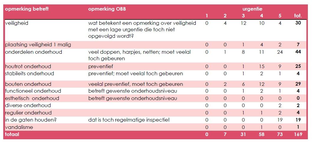 Bij de huidige werkwijze wordt in een veiligheidsrapportage een (veiligheids)opmerking gemaakt: wat moet er gebeuren en met welke frequentie? Deze opmerkingen worden door de gemeente beoordeeld. Zij kijkt wat er moet gebeuren en welke prioriteit de werkzaamheden hebben; vervolgens wordt er onderhoud uitgevoerd. In een beheerprogramma wordt per toestel ingevoerd welke werkzaamheden er zijn gedaan. Een behoorlijk aantal van de opmerkingen heeft betrekking op onderhoud, of kan met regulier onderhoud in de toekomst worden ondervangen (zie figuur 1). Deze notities horen eerder op een werklijst. Andere notities ('in de gaten houden') hebben geen toegevoegde waarde.