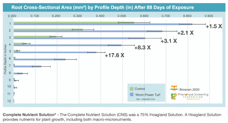 Na analyse van de röntgendata bleken de met Worm Power Turf behandelde planten een aanzienlijke toename in wortellengte én wortelmassa te hebben in verhouding tot de controlegroep (zie figuur). Terwijl de totale worteloppervlakte op 2" (5 cm) gemiddeld al verdubbelde, bleek het worteloppervlak op 5" (12,5 cm) diepte 16 keer zo groot als dat van de controlegroep. Ook waarneembaar in de figuur is de toegenomen wortellengte per profieldiepte: van 6" (15 cm) bij onbehandeld naar 11" (27,5 cm) bij de behandelde groep. Daarbij is het gemiddelde worteloppervlak verdubbeld (zie figuur), ook de gedroogde wortelmassa toonde een toename van ruim 90 procent bij de behandelde planten.