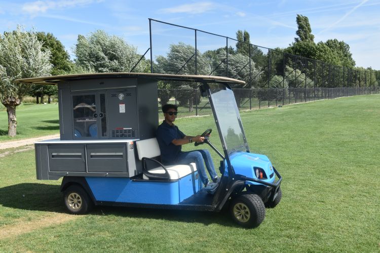 Een andere bijzonderheid die Pols compleet leverde, moeten we met behulp van een app opzoeken in de baan. Het gaat om een luxe cateringwagen in huisstijlkleuren. Deze is opgebouwd op een Cushman Shuttle 2, een werkpaard dat gebruikmaakt van lithiumaccu's. Hier kunnen de golfers onderweg een gekoeld natje en droogje nuttigen, zoals ijsjes, verschillende drankjes en versnaperingen. Afrekenen gebeurt digitaal. Het geheel is opgebouwd uit losse units, bestaande uit laden en kasten voor verschillende producten en restafval. Als dit wordt gewenst, bestaat zelfs de mogelijkheid om een unit met een biertap uit te rusten. Op weg naar de cateringwagen spreekt Wolters zijn bewondering uit voor de keuze die vooral Mart Jan Groenendijk, directeur van Golfbaan Delfland, hierbij maakte: 'Het is een onderdeel van zijn visie om van alle elementen van het golfen op de baan een echte beleving te maken. Niet voor niets staat er op deze cateringwagen, en op alle nieuwe EZGO-golfbuggy's waarmee golfers en medewerkers de hele dag rondrijden: "Golfbaan Delfland, golfplezier voor iedereen!"'