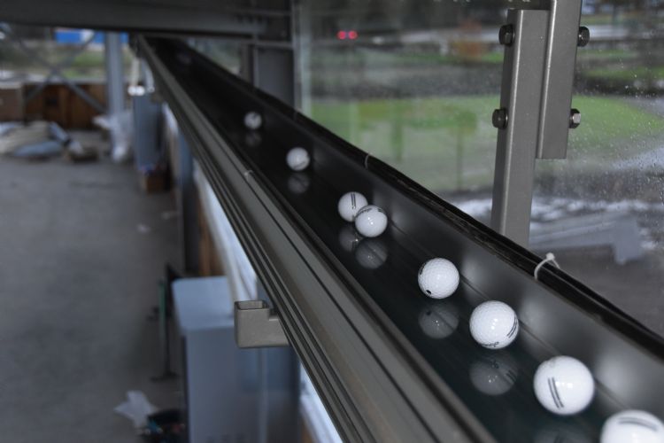 | | De aanvoer van golfballen gebeurt via een lopende band |