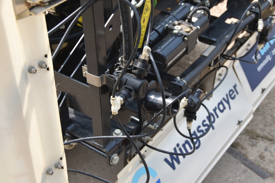 Opvallend is dat de wonderbaarlijke vleugels bij de Wingssprayer de functie van de traditionele driftbeperkende spuitkappen hebben overgenomen. De spuitdoppen zijn tijdens het spuiten gewoon zichtbaar aan de achterzijde van de machine. Daarbij word de spuitboom aan het uiteinde met sensoren automatisch op een hoogte van 25 cm gehouden. Hoeben verklaart hierover: 'Meestal realiseer je met spuitkappen of met een grove druppel een driftreductie van 50 procent. Bij ons systeem is dat 99,8 procent. En dat is vastgesteld door WUR. Dat betekent ook dat je het spuitwerk kunt afmaken als het opeens harder dan windkracht 5 gaat waaien. Het unieke is dat spuiten met het Wingsspray-systeem zelfs bij harde wind beter werkt!'