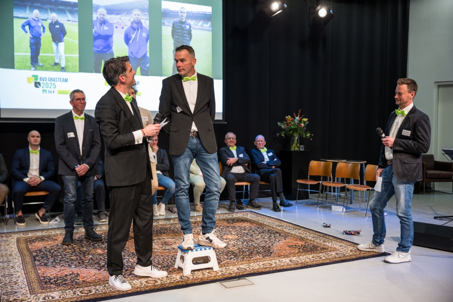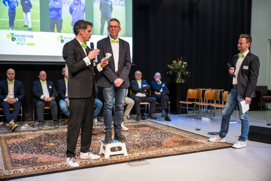 Peter Bartels (l) en Tomas van Tetering (r) van DLF met Fieldmanager of the Year René Kamstra (midden).