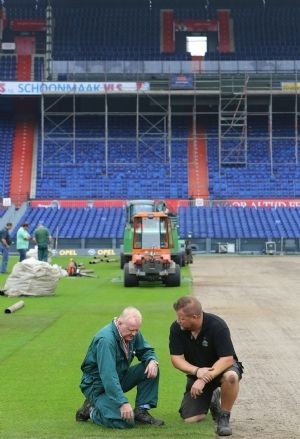 Medewerkers van Hendriks Graszoden uit Heythuysen (NB) leggen samen met Erwin Beltman, teamleider veldonderhoud van Feyenoord, een nieuwe grasmat in De Kuip.