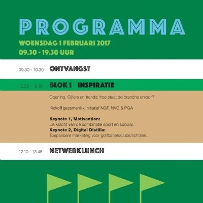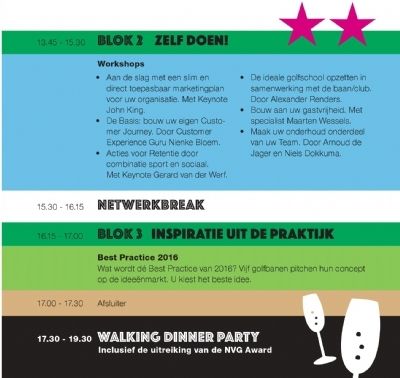 Het programma duurt van 9:30 tot 17:30 en wordt aansluitend afgesloten met de NVG Award, die vorig jaar naar Robert-Jan Derksen ging. De award wordt jaarlijks overhandigd aan een persoon of organisatie die zich verdienstelijk heeft gemaakt voor de ontwikkeling van de golfsport.