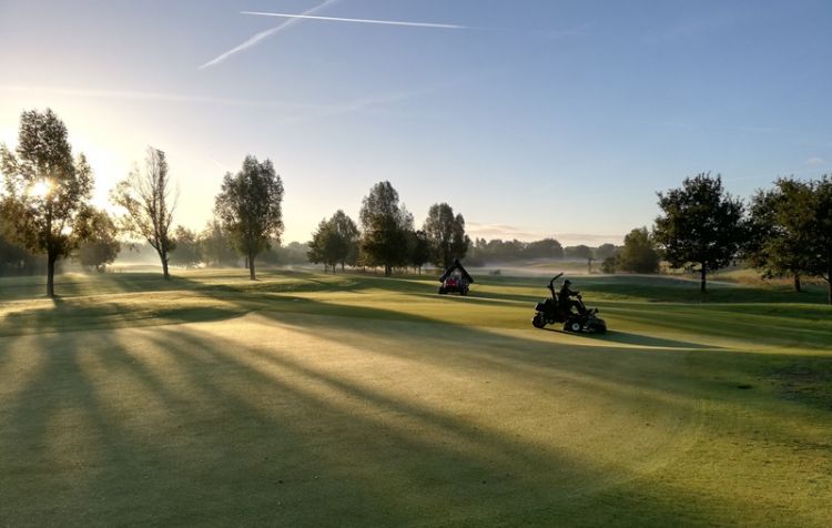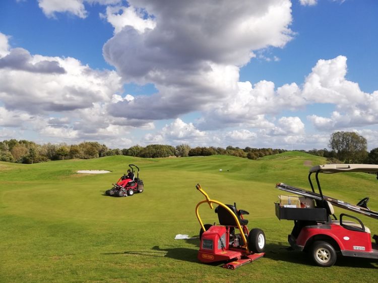 Timmerman heeft zich dit jaar vooral gestort op het doorzaaien van de greens met struisgras en van de tees en fairways met raaigras. ‘De golfbaan bestaat uit drie verschillende omgevingen met veel hoogteverschillen; er is een bosgedeelte, een poldergedeelte en een linksgedeelte. Dit vergt een verschillende aanpak van de greens. In het poldergedeelte liggen enkele natte greens en dus vind je daar meer straatgras. Op het hoger gelegen gedeelte, dat is aangelegd op een voormalige vuilnisbelt, zijn de greens altijd droog en vormt straatgras geen probleem. We willen het viltgehalte en het stressniveau van de grasplanten op de greens naar beneden brengen en het wortelpakket verbeteren. De greens zijn bovendien hobbelig. We steken er veel tijd in om ze weer perfect bespeelbaar te maken.’ De greens worden gemaaid op 5 mm. Afgelopen zomer heeft Timmerman met zijn team vijf tot zeven dagen in de week gemaaid. Momenteel (oktober-november) maait het greenkeepingteam om de dag.