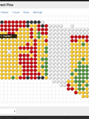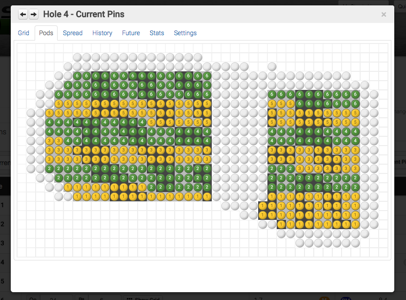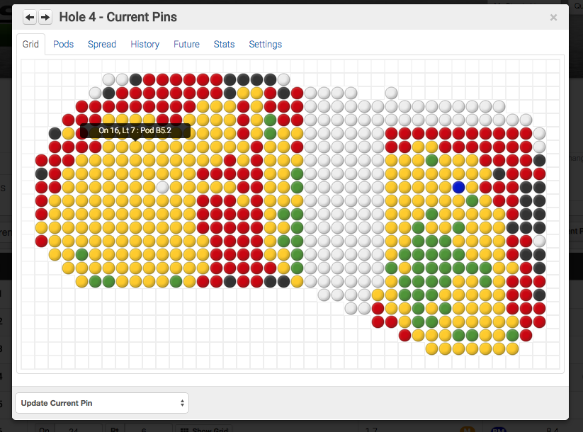 Dat biedt niet alleen de golfer, maar ook de greenkeeper de nodige voordelen, vertelt Visser. Hij toont een afbeelding van de green met daarop een tiental cirkeltjes, die gelijkmatig verdeeld zijn en samen het hele greenoppervlak bestrijken. 'De green wordt digitaal opgedeeld in een groot aantal locaties (pin-points met daaromheen een bepaalde afstand, de cirkels op de kaart, red). De ingebouwde kalender kan van achttien holes bijhouden waar de pin-point staat en heeft gestaan. Zo kun je zorgen dat de vlag niet te vaak op dezelfde plaats staat, maar je kunt de plaats van de vlag ook aanpassen aan bepaalde omstandigheden.'
