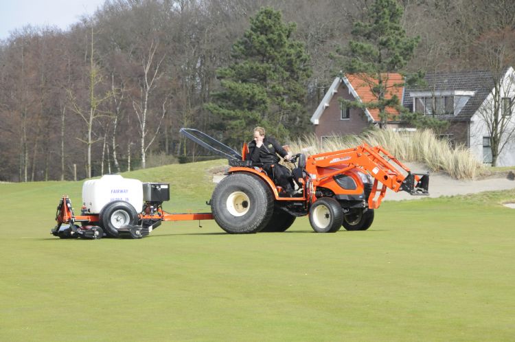 Terug naar de fairwayroller van Smithco. Er is voor zover bekend geen onderzoek naar gedaan, maar de voordelen die gelden voor een greensroller gelden waarschijnlijk ook voor een fairwayroller. Wat betreft het gebruik en de opbouw heeft uw auteur dat met eigen ogen mogen aanschouwen. De Smithco is verbluffend eenvoudig in opbouw. Afhankelijk van de gekozen werkbreedte van 10 of 15 voet, bestaat de machine uit drie of vijf metalen rollen in een frame dat achter een utility truck of tractor gehangen kan worden. De roller is voorzien van zijn eigen hydrauliek, die zorgt dat de machine zich opdrukt op de rollen of rust op de wielen. Als Willem Slats junior een demonstatie geeft, is meteen duidelijk dat dit veel sneller gaat dan het maaien van een fairway. Je kunt probleemloos met 10 tot 15 km/uur over de baan rijden.