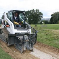 Met een speciaal gefabriceerde kar met afwerkbalk achter de trekker wordt de Graustabiel® vanuit het depot naar de plaats van verwerking gereden en over de geprofileerde onderbaan verspreid. Het omliggende terrein wordt daardoor niet bereden.