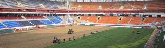 Het herbezoden van een BVO-veld door een graszodenkweker is geen nieuws meer. Als een Nederlandse zode naar Moskou wordt getransporteerd is dat wél nieuws. Deze foto werd ons gestuurd door Martin Rienks van Queens Grass, die de zoden voor deze Russische topploeg Lokomotiv mocht leveren. Hoewel Queens Grass ook een kwekerij in Rusland heeft, werd voor dit project een Nederlandse zode gebruikt.