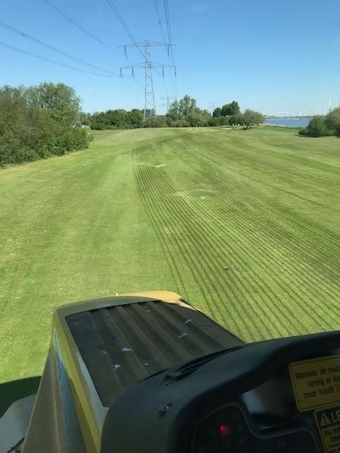 Ook wat betreft het maaien was het voor HGM even afwachten wat de gevolgen van de drijfmest zouden zijn. Scherff: 'Wij waren ons ervan bewust dat we problemen zouden krijgen met kooimaaiers. Als de drijfmest niet snel genoeg intrekt en indroogt, kan het maaien met kooien op problemen stuiten. Kooimaaiers geven het strakste maaibeeld op de fairway, maar zijn ook gevoelig voor schade aan ondermes en rondsel. Bovendien wordt de maaihoogte bewaakt door een rol voor en achter de maaicilinder. Als daar vuil aankoekt, kan de maaihoogte verlopen.' Lang uitstellen van het maaien is echter geen optie, want een kooimaaier is bedoeld om een grasmat te onderhouden met maaien en niet om hoogstaand gras af te maaien. 'Al met al was het dus de vraag of we binnen een week alweer konden maaien of dat we tijdelijk een andere maaitechniek moesten toepassen. Maar de problemen met de kooimaaier vielen uiteindelijk mee door de droogte. Al vrij snel was de mest zo zacht als ingedroogde, vezelachtige pulp, en dus niet schadelijk voor de maaier. Na de eerste maaibeurt over de drijfmest was een normale wasbeurt van de machine voldoende om deze weer zuiver te krijgen.' Droogte speelde HGM in dit geval dus in de kaart. Scherff is blij dat het niet te veel geregend heeft. 'Dan spoelt de mest beter in de sleuven, maar blijft het ook vochtiger. Toevallig heeft het voor ons zo goed uitgepakt.'