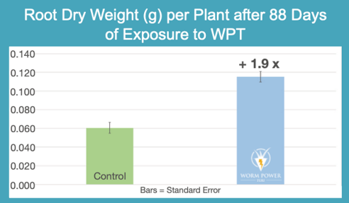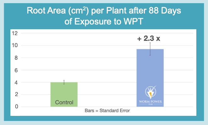 Dit onderzoek laat duidelijk de stimulerende effecten zien van Worm Power Turf op de wortelgroei van planten, waarmee een belangrijk doel bereikt wordt: meer wortelmassa betekent een sterkere plant en een versterkt intern verdedigingssysteem.