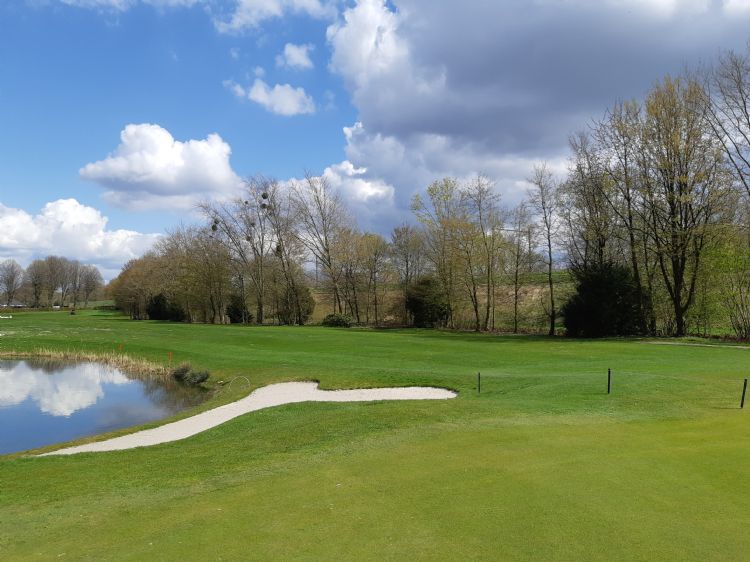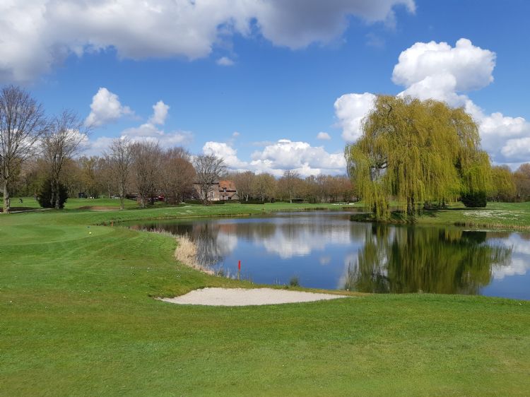 | | De noordzijde van de baan, met de vijver tussen hole 17 en 18 |