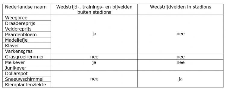 In de loop der jaren zijn we er min of meer aan gewend geraakt dat er gewasbeschermingsmiddelen worden gebruikt in de sport. Toch is het geen vanzelfsprekendheid, en eigenlijk is het ook best raar. Gras is bij uitstek iets 'groens' waar geen chemie bij hoort. Met goed vakmanschap is een mooie en gezonde grasmat te realiseren. Als er gewasbeschermingsmiddelen worden ingezet, is het regulier onderhoud tekortgeschoten. Nu stelt het beoefenen van sport de nodige eisen aan kwaliteit en veiligheid en het is dus niet uitgesloten dat in uiterste gevallen extra hulp nodig is. Maar dikwijls is het gebruik van gewasbeschermingsmiddelen verworden tot symptoombestrijding, met alle gevolgen van dien voor de sportbeoefenaar en het milieu. Het roer moest om. De kern van de aanpak die vanaf 2013 werd ingezet is dat middelen niet meer kunnen, tenzij daar echt niet aan valt te ontkomen. Dat kan het geval zijn als goede en veilige sportbeoefening onmogelijk dreigt te worden en andere maatregelen uitgeput zijn. Naar nu blijkt, zijn dat feitelijk nog maar enkele situaties die op sportvelden kunnen voorkomen. Deze zijn omschreven in de Regeling gewasbeschermingsmiddelen en biociden. In het schema hieronder is aangegeven in welke situaties nog gebruik mag worden gemaakt van gewasbeschermingsmiddelen. Uitzonderingen op het verbod op gebruik van gewasbeschermingsmiddelen voor sportvelden ('ja' betekent dat gebruik is toegestaan)