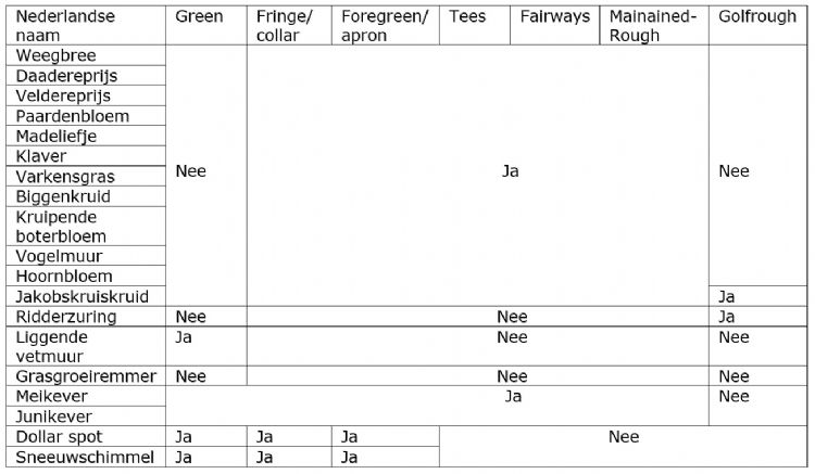 - Door goede monitoring moeten problemen al in een vroeg stadium worden voorkomen. - Volgens een advies van deskundigen kan de inzet van gewasbeschermingsmiddelen in een jaar beperkt blijven tot 20 procent van het speeloppervlak. Wanneer op een sportveld meer gebruik nodig blijkt, is dit een duidelijke indicatie dat er iets mis is en dat het onderhoud nadrukkelijk bijgestuurd moet worden. Uitzonderingen op het verbod op gebruik van gewasbeschermingsmiddelen voor golfbanen ('ja' betekent dat gebruik is toegestaan)