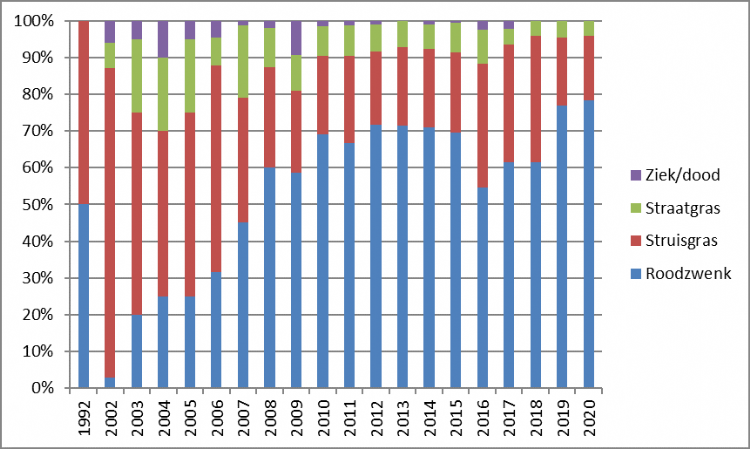 Onkruid pakt het team vooral aan door te sturen op het grasbestand. Van Berkel legt uit: 'Onze greens bestaan vooral uit roodzwenk, dat later opkomt. We hebben 30 procent struisgras om dat op te vangen en te concurreren met ziektes. Elk jaar tellen we de grassen in de greens door middel van foto's; daar gebruiken we een telraam voor. Op basis van die cijfers kijken we wat het percentage is van onze grasbezetting op de greens. We zaaien hier elk jaar door, ook als het niet nodig is. Verjongd gras wordt immers minder snel ziek. Als je schimmels hebt, zie je het jonge gras er vaak meteen doorheen komen.' Bij het doorzaaien kiest hij afwisselend per jaar voor verschillende graszaadleveranciers. 'Niet omdat de ene beter is dan de andere, maar omdat ze andere rassen gebruiken, en die concurreren allemaal met ziektes. Daarom blijven wij continu verjongen. Volledig zonder onkruiden, dat lukt niemand. Maar je kunt er wel voor zorgen dat je op tijd bemest en niet te veel water gebruikt. Met een dichte mat heb je al veel minder onkruiden en ziektes.'