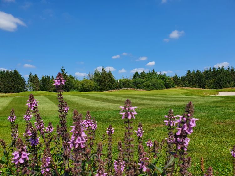 Eind juli maakte Arjan ten Brinke, greenkeeper op de Drentsche, bovenstaande foto van een van de gerenoveerde voorgreens. Ruim een half jaar na renovatie is het resultaat zichtbaar. Niet alleen de strakke grasmat valt op, maar ook de aandacht voor flora en fauna. Op de voorgrond is moerasandoorn (Stachys palustris) te zien, waarvan de bloemen door veel soorten bijen, hommels en vlinders bezocht worden.