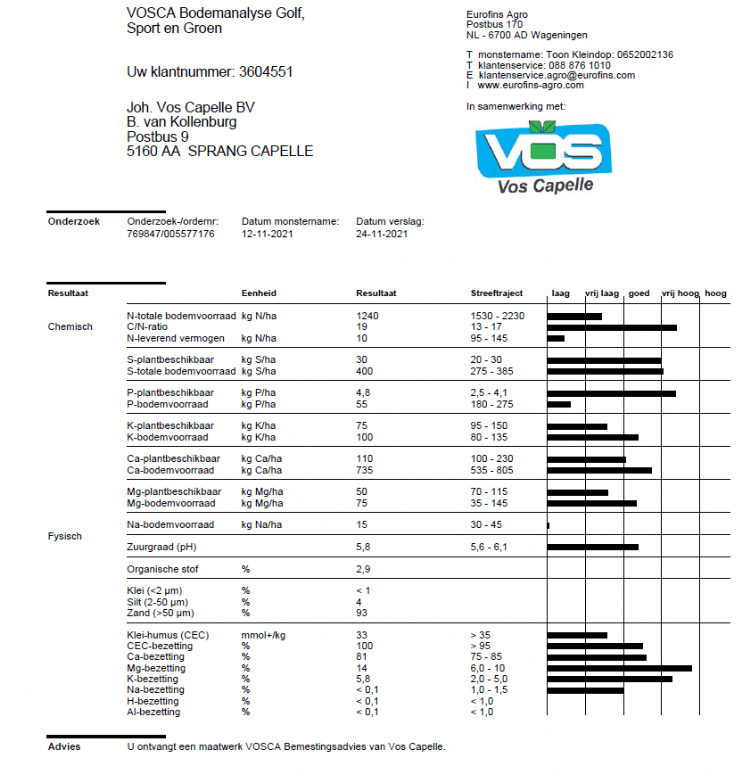 Vos Capelle ging hierover in overleg met Albert Feddes van Eurofins Agro. Gezamenlijk kwamen ze tot de een maatwerk analysepakket, de VOSCA bodemanalyse sport & groen. Deze analyse is qua omvang aanzienlijk compacter, alle belangrijke parameters passen op één pagina.