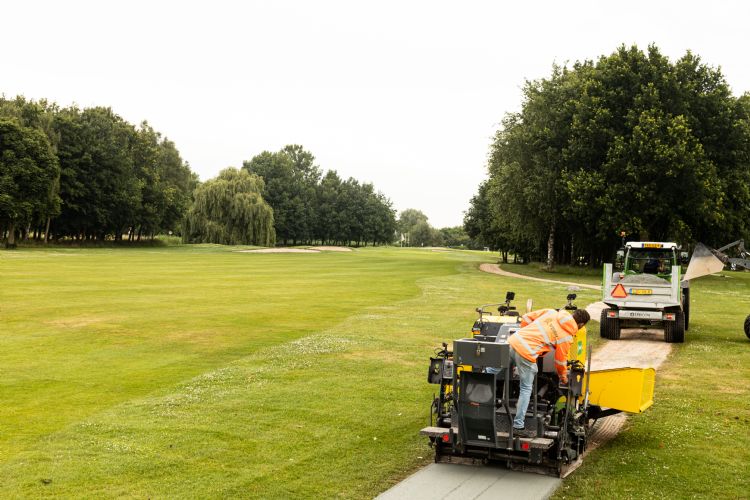 'Landgoed Welderen in Elst vroeg ons om 5 kilometer winterbanen aan te leggen', vertelt Martin Stufken van VDBH. 'Golfbanen worden vaker jaarrond gebruikt, maar het gras is dan wel kwetsbaar. Met de aanleg van winterpaden voorkom je een te zware belasting van het gras. De golfbaan had al een keuze gemaakt voor Bestone en daarmee zijn wij aan de slag te gaan. Bestone was voor ons een tamelijk nieuw product waarmee we nog niet veel gewerkt hadden. In de markt hadden we al wel positieve verhalen gehoord over de eenvoudige verwerking en het goede resultaat. Dat was ook onze ervaring.' Op de golfbaan in Elst zijn deze zomer nieuwe paden aangelegd. De paden zijn 1,80 tot 2,00 meter breed en zijn gebouwd op een fundering van 20 centimeter menggranulaat 0/31. 'Dit hebben we vervolgens netjes verdicht en geprofileerd. Afhankelijk van het terrein is het op de ene plek tonrond en een eindje verderop op één oor. Daarna ging er een toplaag van circa 8 centimeter Bestone 0/8 overheen voor de verdichting.'