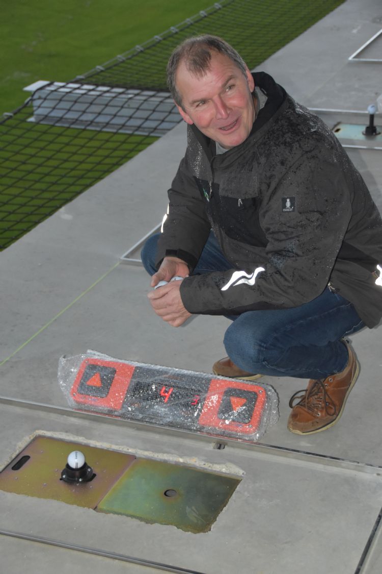 Oskam ziet ernaar uit om straks de baan te gaan onderhouden. Maar, zoals gezegd, deze moet nog grotendeels gebouwd worden. 'Het onderhoud van het gras op de drivingrange wordt overigens geen standaardklus voor me,' voorspelt hij. 'Om deze sprekend te maken, zijn er vlakken die ik als greens moet onderhouden. Daarnaast is er ook een deel als fairway, compleet met semi-rough ingezaaid. Hierbij zijn verschillende grassoorten toegepast die mede het verschil moeten maken. Daarbij is het bijvoorbeeld de bedoeling dat die fairway wat donkerder gaat afsteken tegen de rest van de drivingrange. Bunkers waarin je bal kan komen te liggen, zijn hier niet aangelegd. Daarvoor in de plaats zijn er wel een heleboel targets om zowel de swing als het chippen te oefenen. Borden die de afstanden aangeven, zie je hier niet. Die kan de golfer immers op de led-display naast zich aflezen. Naast de steunpalen van de radarantennes staat er ook nog een tiental palen met led-verlichtingsarmaturen op het veld van de drivingrange. Deze golfamusementbaan zal namelijk ook 's avonds in gebruik zijn. In de toekomst moet ik er uiteraard voor zorgen dat het gras rondom die vele targets, palen en de kleine heuvels, waarachter schijnwerpers verborgen zitten, netjes bijgewerkt is.'