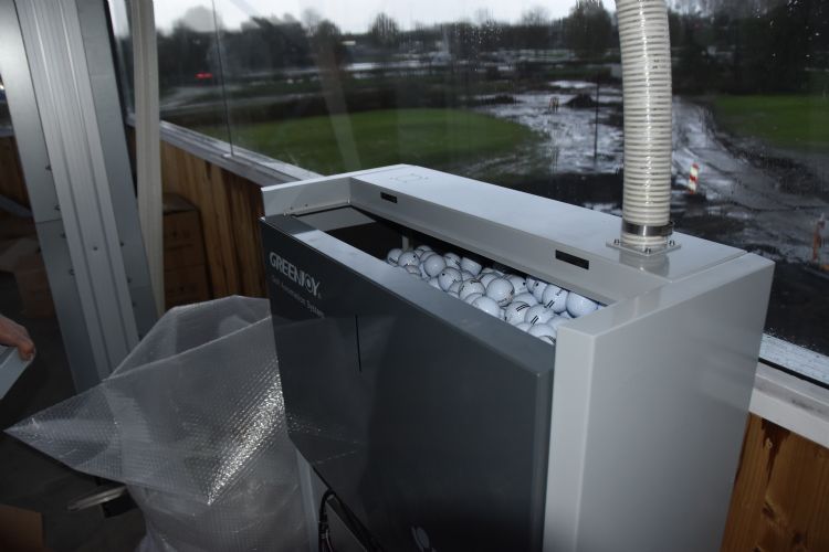 De verzamelde golfballen op de drivingrange worden in een bunker gestort en rollen uit eigen beweging via een brede goot in de richting van de kelder van het afslaggebouw. Nadat de ballenwasmachine ze gereinigd heeft, komen ze na droging in een grote voorraadbak met plaats voor ongeveer tienduizend ballen. Van hieruit brengt een liftsysteem de golfballen omhoog. Zowel op de begane grond als op de verdieping deponeert de ballenlift ze vervolgens op een smalle lopende band. Van hieruit vallen ze door een opening in de dispensers die alle 'op-tee'-mechanismes bevoorraden. 'Elke dispenser, dus dertig op elke etage, wordt zo bijgevuld tot maximaal vijfhonderd ballen,' vertelt Oskam. 'Dit gebeurt zonder gebruikmaking van sensoren die de aantallen registreren. Zodra de band ook de laatste dispenser gevuld heeft aan het einde van de band, gaat de band in omgekeerde richting lopen. Zodoende worden de dispensers waar alweer ballen bij kunnen, opnieuw helemaal gevuld. Aan het einde, als alles vol is, stopt het hele systeem. De frequentie van een nieuwe bevoorradingsronde kun je uiteraard instellen. Gebruikers van het systeem betalen hier straks per uur. Ze mogen in die tijd zoveel ballen afslaan als ze willen.'