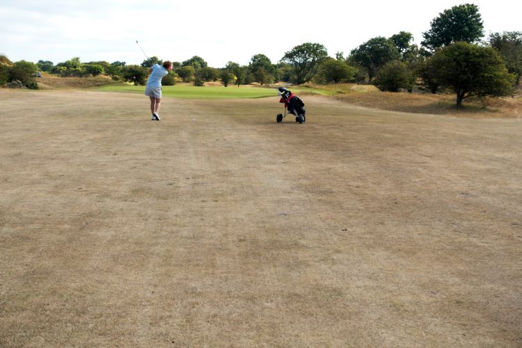 | | Door hitte en gebrek aan regen verkleurt de golfbaan. (Foto: Jan van Mondfrans) |