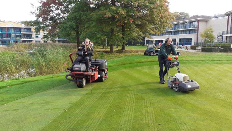 Als het tijd is voor groot onderhoud, roept Koopman de hulp van zijn dochter Hannelore in. 'Alleen vermaak ik mij perfect, maar met z'n tweeën gaat het sneller.' Zij is echt een greenkeepernatuurtalent. Als een soepel lopende machine zorgen vader en dochter dat de baan in één dag belucht, gerold, doorgezaaid en bezand wordt, samen met de inzet van de vertidrain die door een SBA-collega bediend wordt.