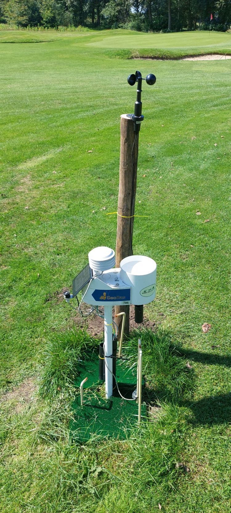 Dit jaar hebben we een windmeter op ons weerstation aangesloten om de ET beter in beeld te krijgen. Dit is de berekening van de vochtverdamping van grond en gewas, gerelateerd aan de luchttemperatuur, luchtvochtigheid en bodemtemperatuur. Hiermee krijg je niet alleen inzichtelijk wat je kunt aanvullen met beregening; je kunt ook beter verschillende jaren met elkaar vergelijken en de relatie zien met de ontwikkeling van dollarspot. Bij oostenwind verdrogen de greens vele malen sneller dan bij westenwind, ondanks eventuele neerslagverschillen.