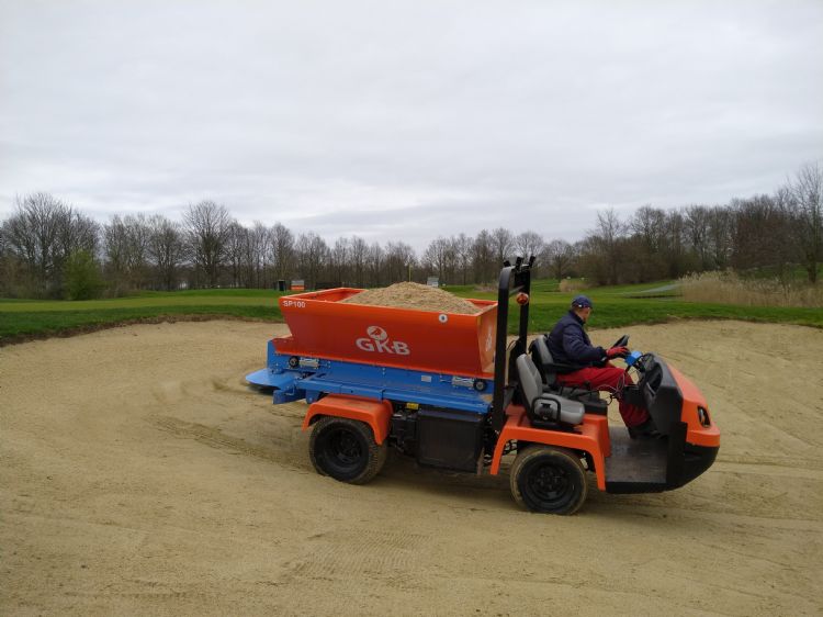 Een recent voorbeeld van die interactie is de Sandspreader, waarvoor GKB een nieuw soort schotels ontwierp en uitprobeerde op Cromstrijen. Bestebroer heeft twee van zulke bezandingsmachines in gebruik: een SP300 die sinds 2017 dienstdoet, en sinds kort een SP100. Dat is een bezandingsmachine met een bak van 1 kuub die op Golfclub Cromstrijen wordt gebruikt voor het bezanden van de tees en de greens. 'De machine geeft een mooi strooibeeld; dat is uiteraard het allerbelangrijkst', vertelt Bestebroer, die voor de fairways zijn Sandspreader type SP300 in gebruik heeft. 'De techniek van zo'n bezander is in feite vrij eenvoudig, maar het verschil zit hem in de details, zoals de schoepen op die schotels. En die 300 heb ik inmiddels al zeven jaar in gebruik, dus ik kan de kwaliteit goed beoordelen. Ze gaan nooit stuk.' De SP300 maakt flink wat kilometers. In totaal telt Cromstrijen ongeveer 15 hectare aan fairways en Bestebroer rekent voor dat er gemiddeld 40 kuub zand per hectare gebruikt wordt. Met een inhoud van 3 kuub betekent dat dat de Sandspreader SP300 heel wat tijd in bedrijf is voordat de volledige golfbaan is bezand. Het bezanden van de tees en greens gebeurt uiteraard veel frequenter; de SP100 bezander rijdt wekelijks rond.