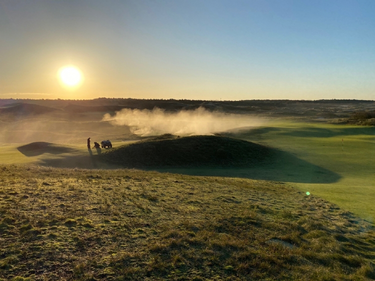 Het afblazen gebeurt altijd voor de winter, om te voorkomen dat de beregeningsinstallatie kapotvriest. In het voorjaar wordt de boel weer aangesloten. 'We zijn hier altijd óf heel vroeg of heel laat met afblazen, maar we zijn nooit bang om te laat te zijn.' Voor de foto was dit precies op tijd, want de opkomende zon, de medewerkers, de kar en het omhoog spuitende water geven samen een prachtig beeld in het duinlandschap. 'Het gebeurt wel vaker dat hier een soort nevel over de baan hangt, maar deze combinatie is zeldzaam.'