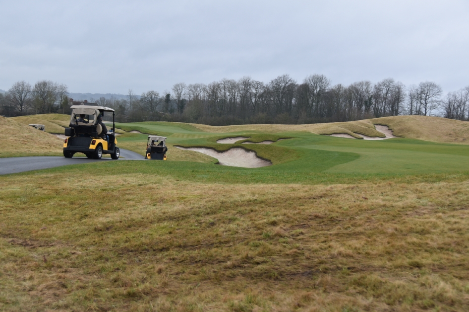 Coursemanager Cullam Wark heeft twintig E-Z-GO's in JCB-bedrijfskleuren klaargezet voor een rondrit langs de 18 holes, samen met drie greenkeepers uit zijn team. De golfbuggy's zijn een belangrijk onderdeel van de hospitality. De baan wordt in januari en februari altijd gesloten om onderhoud te kunnen uitvoeren. Wark vertelt allereerst dat er sprake is van een lage speeldruk op de baan: dagelijks gemiddeld zo'n 30 golfers. Naast twee chipping-greens telt de baan 18 holes, met een totale greenoppervlakte van 2 hectare, dus méér dan 1.000 vierkante meter per green. Deze greens en ook de foregreens en aprons worden met smalle units met de hand gemaaid (met respectievelijk 18- en 22 inch-Jacobsen-kooimaaiers). Wark: 'Handmatig maaien heeft als groot voordeel een hogere kwaliteit. De knipfrequentie is hoger dan bij een standaard triplexmaaier. Bovendien gaat er minder gewicht over de greens.'