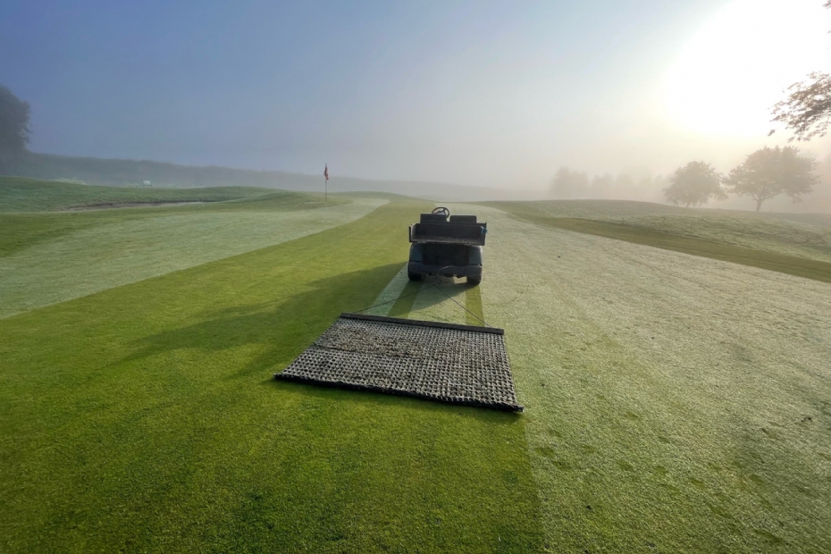 Een bijkomend voordeel van het gebruik van een mat is dat tegelijkertijd de wormhoopjes verdwijnen en de green weer mooi glad wordt. 'Zo sla je twee vliegen in één klap', stelt Düz vast. Deze foto heeft hij gemaakt met zijn telefoon en gedeeld via sociale media. 'Ik heb er al diverse leuke reacties op ontvangen, met name van collega's.' Positieve reacties krijgt hij ook van golfers over zijn werk op de baan in Roosendaal. 'Iedereen geeft complimenten en constateert dat de baan in negen maanden enorm verbeterd is. Heel leuk om te horen, natuurlijk, en voor mij een extra motivatie om mijn werk te doen.' Dauw slepen is en blijft daarvan een belangrijk onderdeel. Dauw niet verwijderen is immers vragen om problemen.