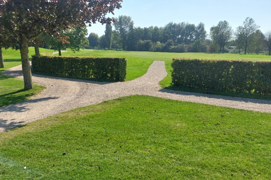 De nieuwe, landelijk ogende buggypaden werden aangelegd door VDBH. Dankzij de expertise en vooral ook de spreidmachine van dit bedrijf kon het project binnen de gestelde termijn en zonder overlast voor de spelers worden afgerond. Toonen vertelt over de aanleg: 'In september 2022 vond de renovatie plaats. Er is gekozen voor deze periode omdat het materiaal een minimale bodemtemperatuur nodig heeft. We hadden een onderhoudscontract met VDBH afgesloten om elk jaar twee rondes te doen. Maar sinds de aanleg blijkt onderhoud overbodig, dus dat contract hebben we ontbonden; we werken nu op basis van beeldkwaliteit.' De werkzaamheden op Golfbaan Kromme Rijn vonden ook in 2022 plaats. Kahnt: 'Alle paden zijn tegelijk ook verbreed, zodat er nu twee personen naast elkaar kunnen lopen. We hebben zelf een aanpassing in het ontwerp aangebracht: bij de teebox is een oor aangelegd waar de buggy's kunnen keren. Daaraan kon je toch zien dat de ontwerpers geen golfers waren.'