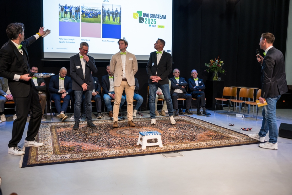 De vertegenwoordigers van de BVO grasteams. Henk Slootweg (ADO Den Haag - Sparta Rotterdam), Eddy van Endert en Wouter Lantmeeters (KRC Genk) en Gijs Boer (N.E.C. Nijmegen)