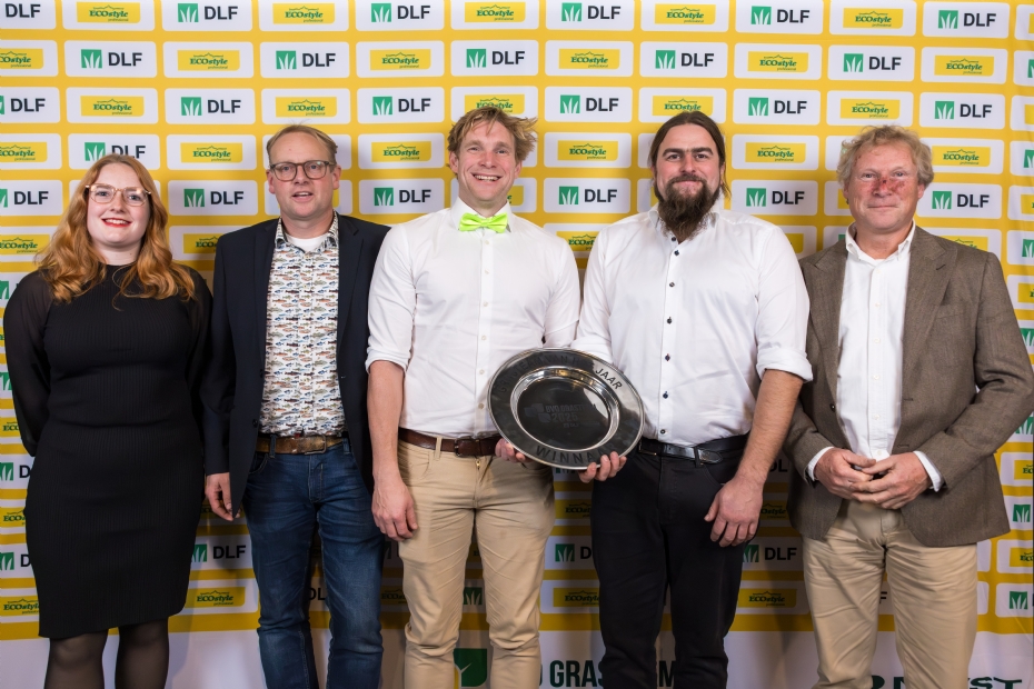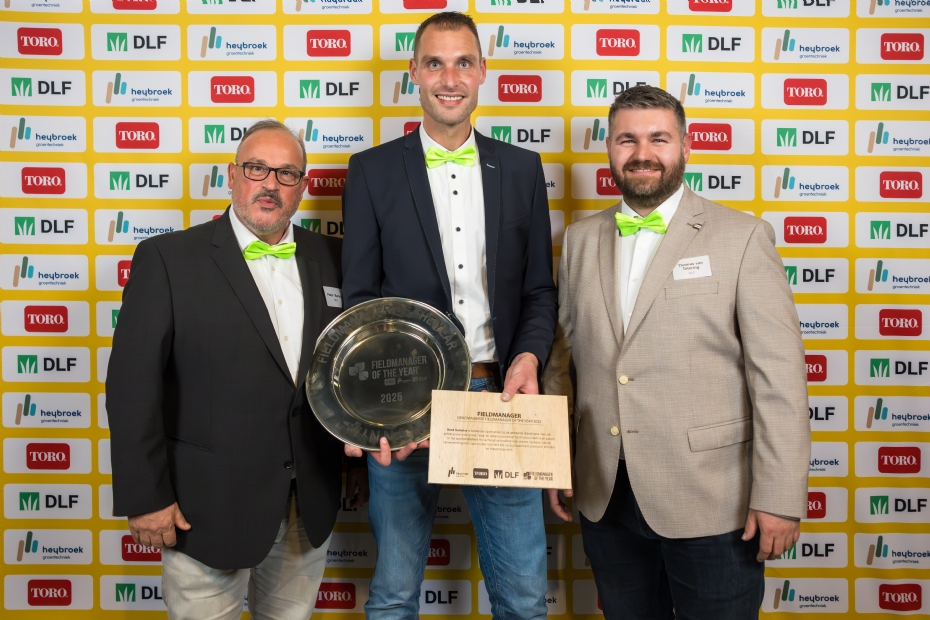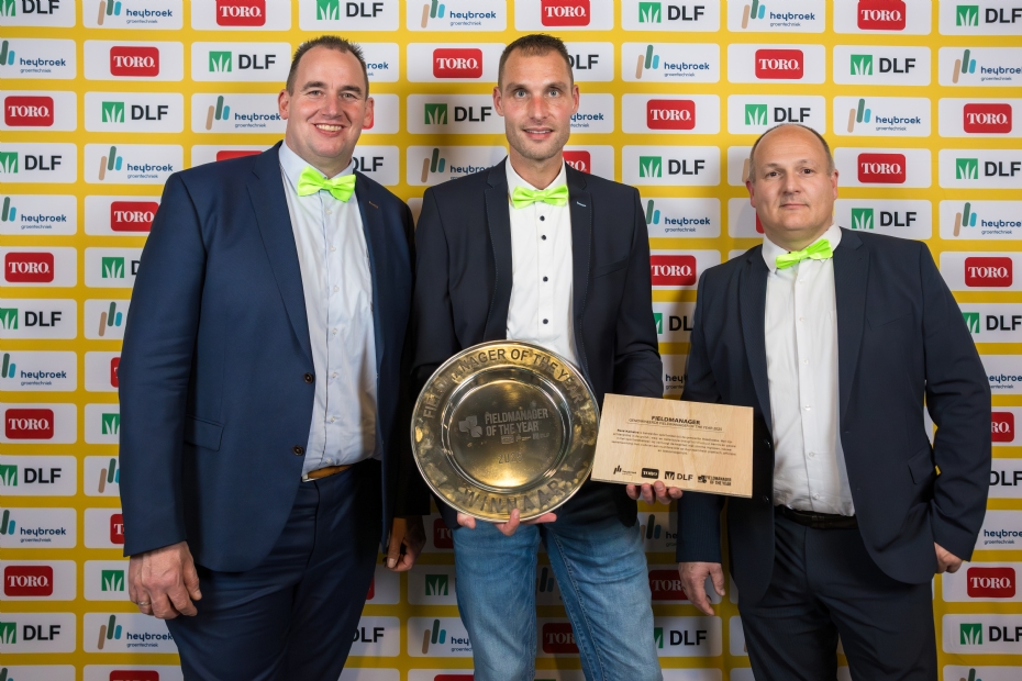 Peter Bartels (l) en Tomas van Tetering (r) van DLF met Fieldmanager of the Year René Kamstra (midden).