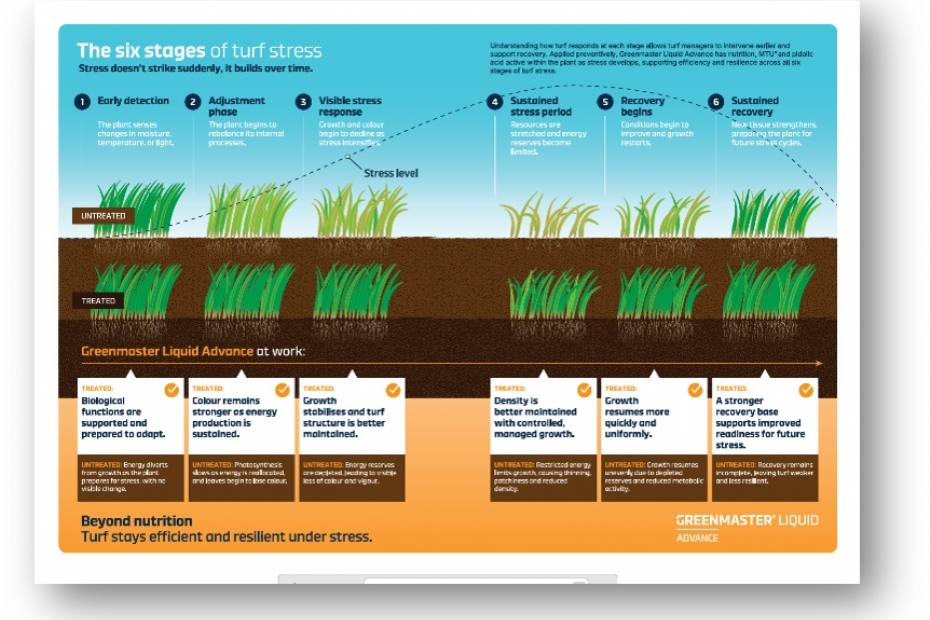 Een van de belangrijkste inzichten achter de ontwikkeling van Greenmaster Liquid Advanced betreft de opbouw van stress bij gras. Onder laaglichtcondities, zoals in herfst en winter, heeft een grasplant het van nature moeilijker om energie te produceren en vast te houden. Timmermans beschrijft hoe de biostimulanten juist in dergelijke situaties kunnen helpen: 'Wat je dan ziet is dat de plant zich niet alleen beter houdt dankzij het langer actief chlorofyl na een periode van droogtestress of laaglichtstress, maar voornamelijk ook daarna weer sneller kan bijschakelen.' Hij merkt op dat dat niet alleen theoretische winst is, maar meetbaar effect heeft op de groei en vitaliteit van de grasmat.
