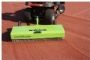 Kleine kunstgrasreiniger manouvreert tussen speeltoestellen